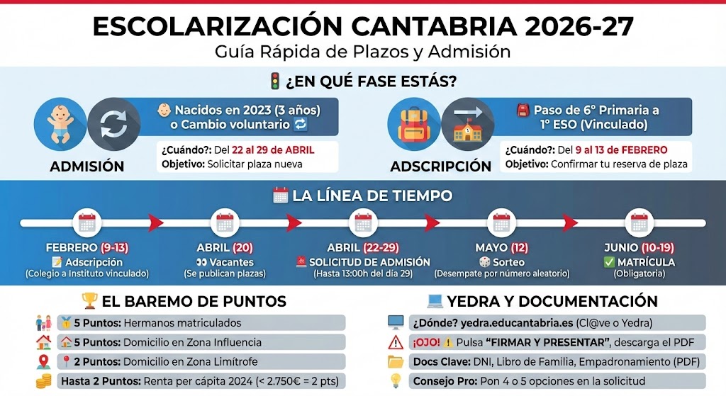 Información actualizada sobre el proceso de escolarización en Cantabria. Fechas clave, diferencias entre adscripción y admisión, uso de Yedra y cálculo del baremo.