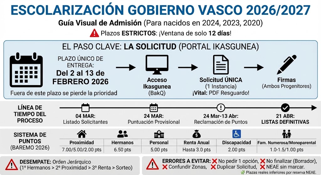 El País Vasco tiene uno de los calendarios de admisión más tempranos y más cortos de España: 12 días naturales en febrero, cuando la mayoría de comunidades ni siquiera han abierto plazo. Quien no tenga la documentación preparada a finales de enero se arriesga a presentar la solicitud con prisas o fuera de tiempo.