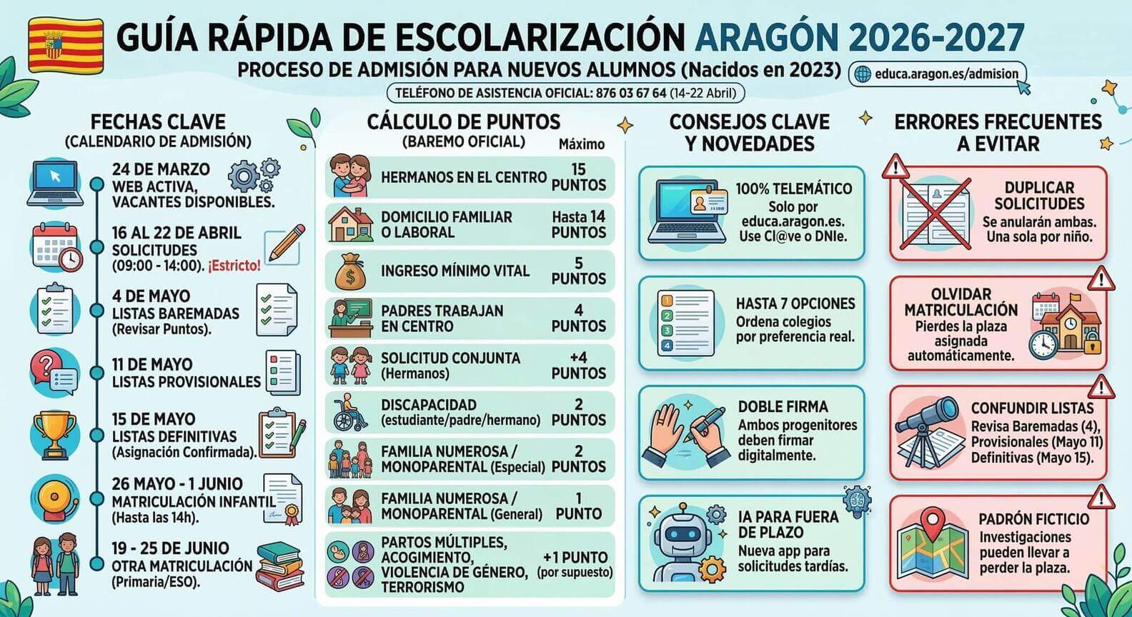 ✅ Información Oficial Actualizada: El Departamento de Educación del Gobierno de Aragón ya ha publicado las fechas, baremos y novedades para el curso 2026-2027. Este año se estrena una plataforma con Inteligencia Artificial (IA) para agilizar las solicitudes fuera de plazo y se ha habilitado un teléfono oficial de asistencia para las familias: 876 03 67 64 (operativo del 14 al 22 de abril).