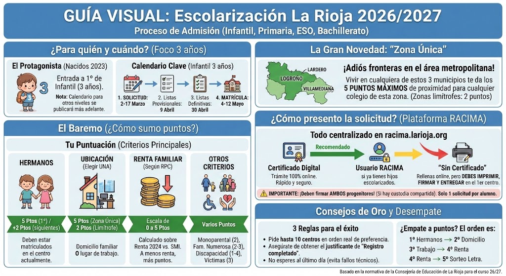 Información completa sobre el proceso de escolarización en La Rioja 26/27. Plazos de admisión, cálculo de baremo, uso de la plataforma RACIMA y consejos para la solicitud.